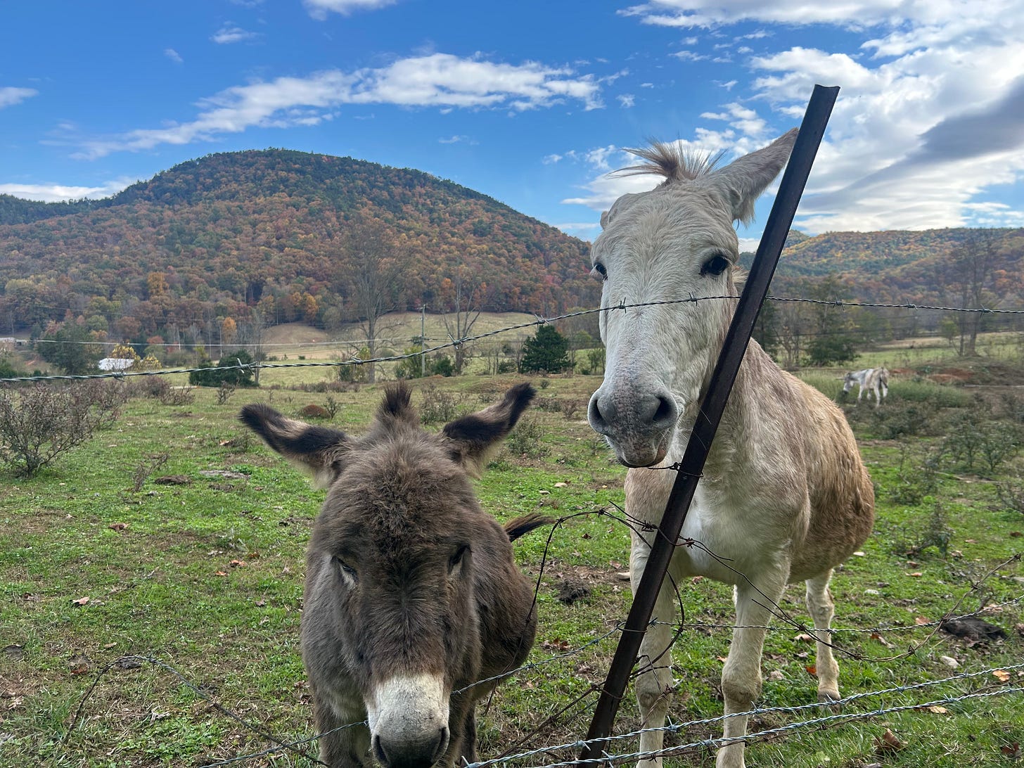 I have almost 2000 miles on my bike. I pass the same beautiful fields, mountains, streams, and raggedy farm animals every time I ride. Today, for the first time, I saw the shortest donkey, and she was either very pregnant or drawn by Dr Seuss. She was so cute, and the mountains behind her were right out of a Hopkins poem, “Landscape plotted and pieced--fold, fallow, and plough.” I decided to get the picture I wasn’t going to take. Typically, farm animals have no interest in me, so I was rather surprised when little fatty ran toward me. And then it happened. If you’re not an animal person, stop reading.